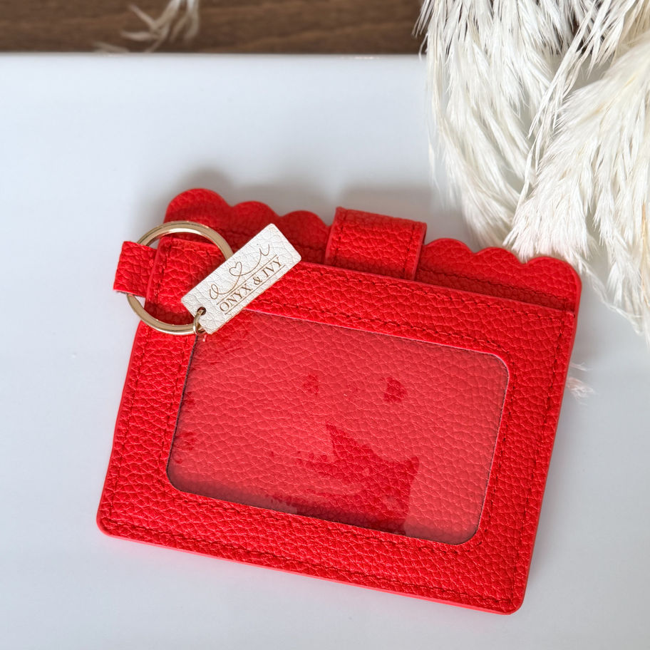 Keep your essentials organized in style with our Scallop Card Holder. Featuring multiple card slots, a secure snap closure, and a clear ID window on the back, this compact wallet is designed for everyday convenience. The attached key ring makes it easy to clip to your keys, bag, or wristlet so everything stays in one place.